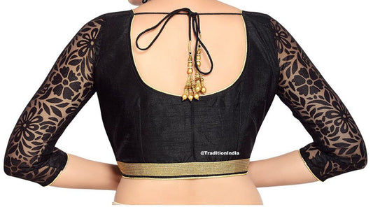 Ready To Wear Black Dupion Silk 3/4 Net Sleeve Saree Blouse, Ready To Wear Blouse, Indian Saree Blouse, Sari Blouse, Saree Blouse