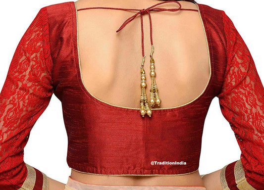 Ready To Wear Red Dupion Silk 3/4 Net Sleeve Saree Blouse, Ready To Wear Blouse, Indian Saree Blouse, Sari Blouse, Saree Blouse