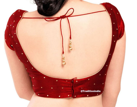 Saree Blouse, Maroon Dupion Silk CZ Stone Work Short Sleeve ,Ready To Wear Blouse, Indian Saree Blouse, Sari Blouse, Padded Saree Blouse