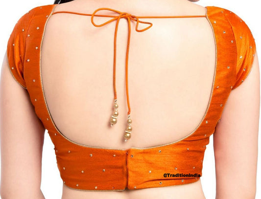 Indian Saree Blouse, Orange Dupion Silk CZ Stone Work Short Sleeve ,Ready To Wear Blouse, Indian Saree Blouse, Sari Blouse, Padded Saree Blouse
