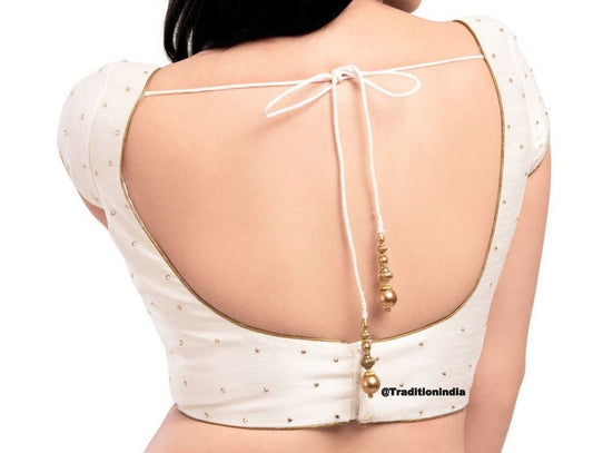 Saree Blouse, White Dupion Silk CZ Stone Work Short Sleeve ,Ready To Wear Blouse, Indian Saree Blouse, Sari Blouse, Padded Saree Blouse
