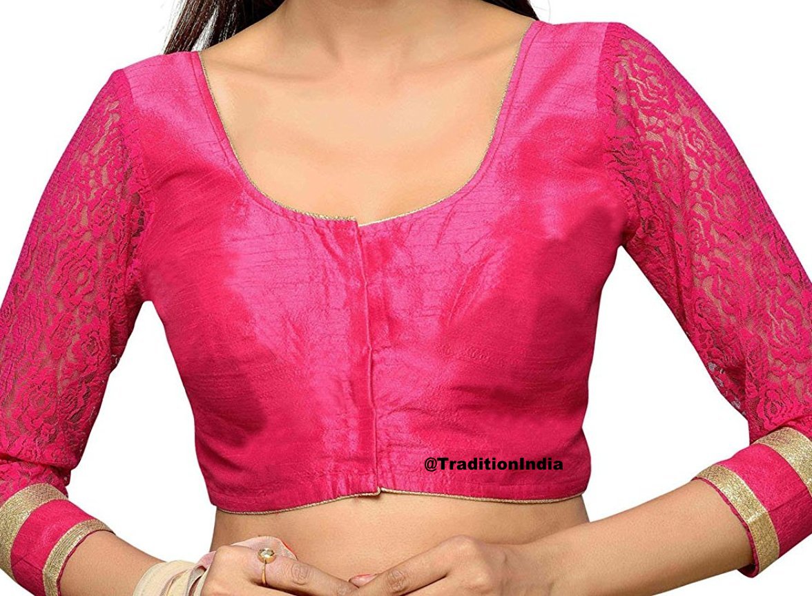 Readymade Hot Pink Dupion Silk 3/4 Net Sleeve Saree Blouse, Ready To Wear Blouse, Indian Saree Blouse, Sari Blouse, Saree Blouse
